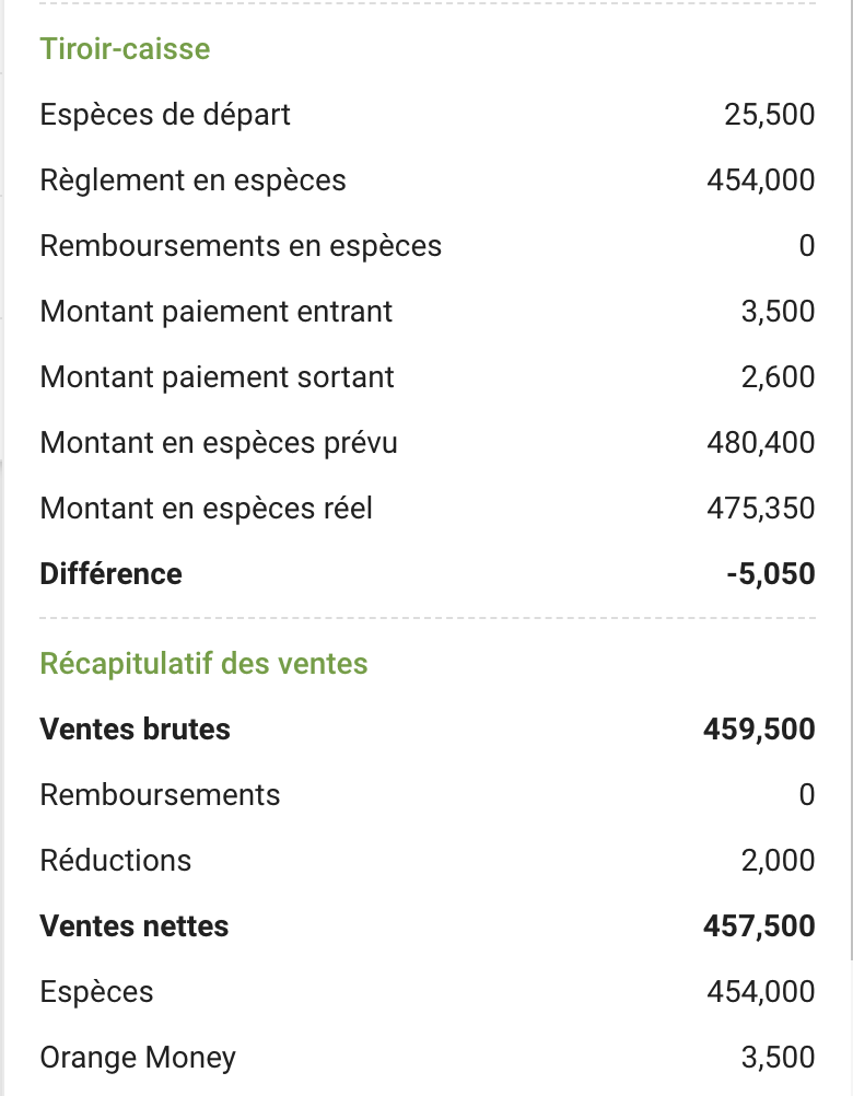 Les quarts de travail retracent le fond de caisse, les entrées et sorties d’espèces de la caisse, les remboursements, les rabais afin de calculer le montant prévu dans la caisse à la fin d’un quart de travail. Ils génèrent également un rapport des ventes (voir ci-dessous) à la fermeture du quart de travail.